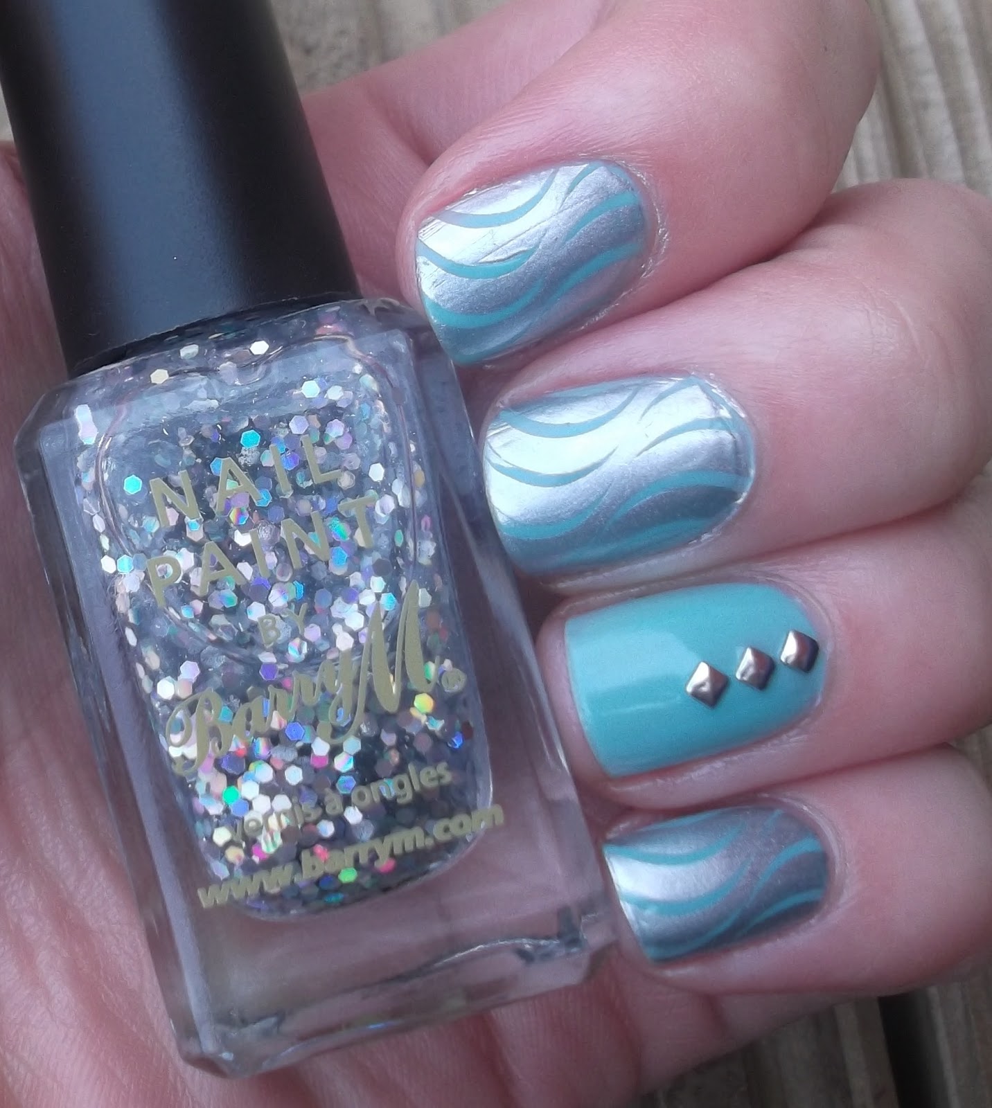 For this manicure I used Barry M Mint Green as the base colour. This is a gorgeous polish but does require three thin coats for a nice solid colour with no visible nail line. I then stamped using Barry M Silver Foil and the swirly line design found on plate BM 205.