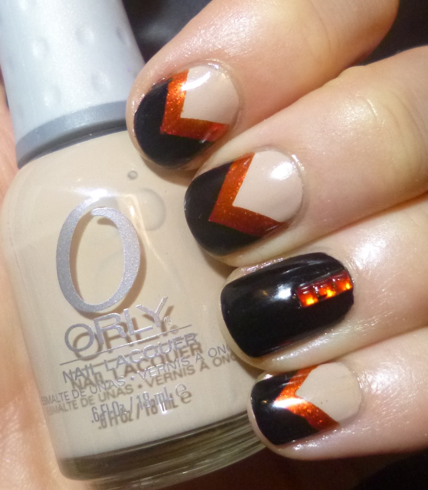 I taped off half off each Glow based nail with a pre cut chevron strip I purchased on eBay. I then painted the visible part of my nail with Orly Flicker. A stunning copper polish that I unexpectedly adored last time I wore it. At this point I added another slick of Seche Vite and sat with hubby to catch up on TV...