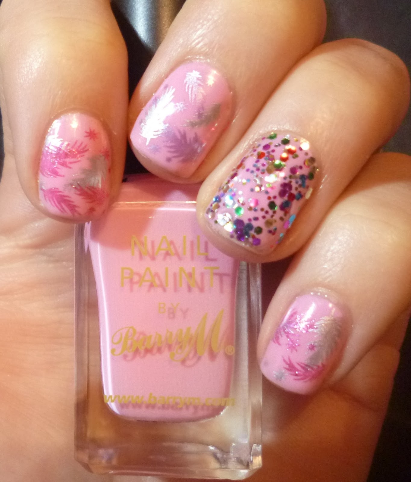 Using Barry M Silver Foil I stamped the feather design from Konad plate M77 on all nails except my ring finger. Then using Barry M Pink Foil I placed the same feather designs at differing angles so that each nail featured several pretty feathers.